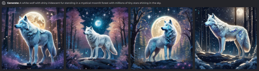 Result: interesting, dreamlike, mystical wolf images. A little too much purple and pink in the generated images imho. I would like it better with a bluer color scheme. My favorite is the second creation.