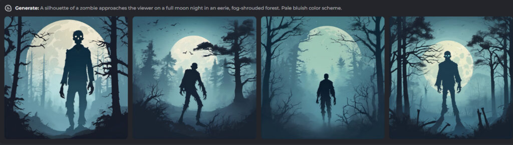 Result: I like the color tone and the overall mood of the images. It was a good idea to describe the colors in the prompt. The second picture turned out to be scary enough. The last image has a strong, centered composition. Zombie eyes can be made more dramatic with a small brush in an image editing software.